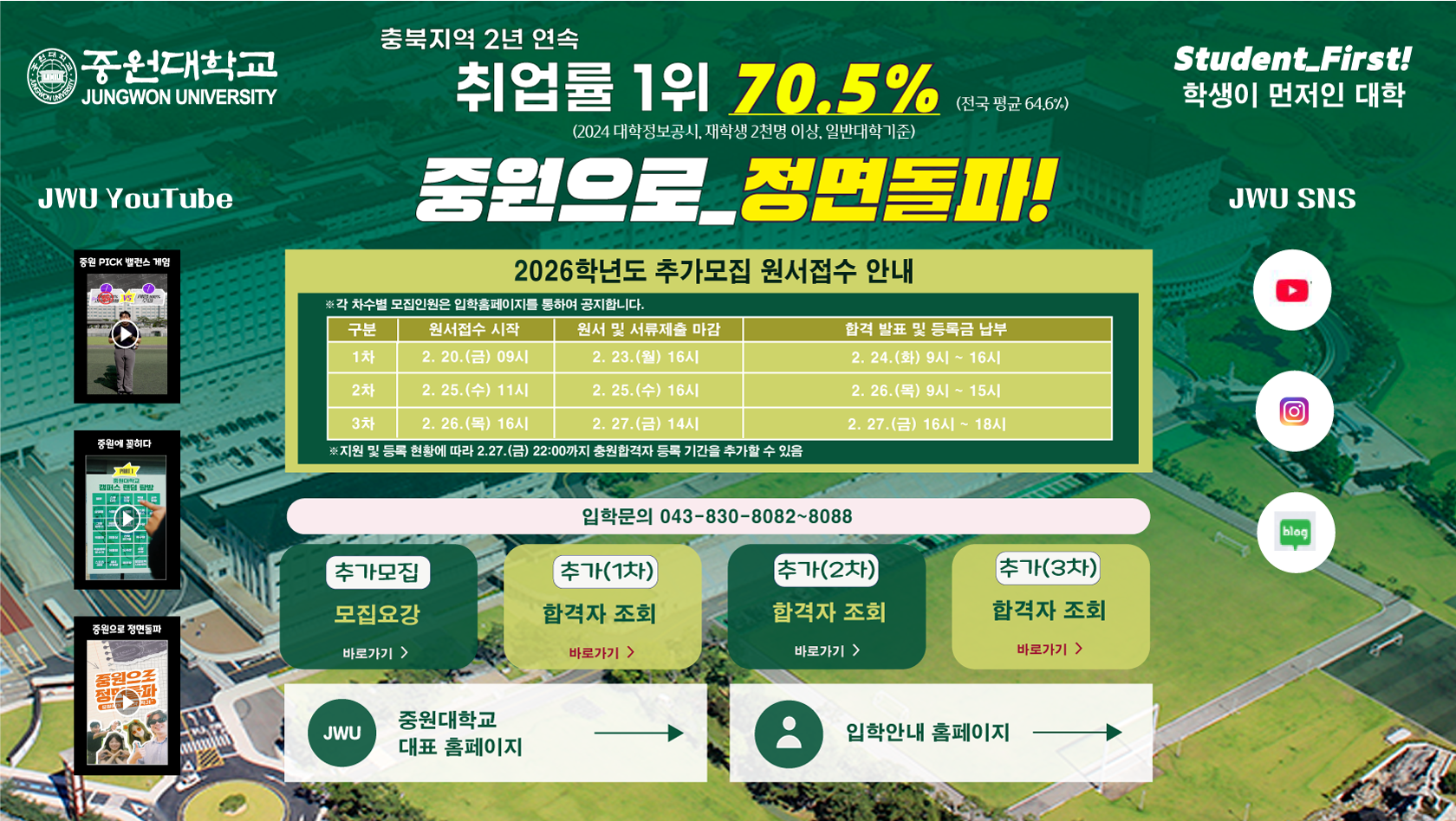 중원 PICK 밸런스 게임 중원에 꽂히다 중원으로 정면돌파 추가모집 모집요강 추가1차 합격자조회 추가2차 합격자조회 추가3차 합격자조회 중원대학교 홈페이지 바로가기 입학처 홈페이지 바로가기 중원대학교 유튜브 중원대학교 인스타 중원대학교 블로그
